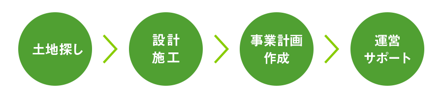 土地探しから収支計画の作成、銀行融資フォロー、設計・施工・運用サポート・開設までトータルでサポートします。